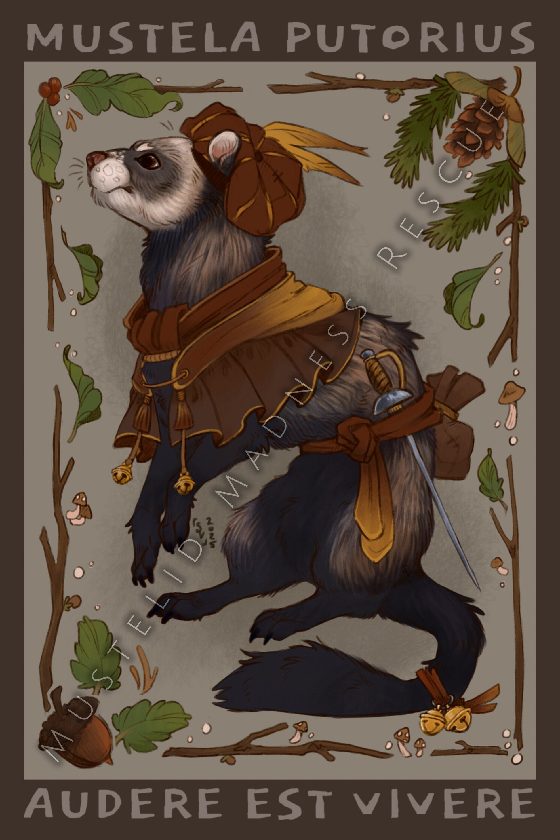 This incredible custom artwork by Saffyre Arts features Wolfie the dashing ferret, prepared to face all challenges! "Mustela Putorius" is the latin scientific name for polecats, invoking Wolfie's bold ancestors, while "Audere est vivere" is latin for "To dare is to live"- there is no better phrase to embrace the ferret's outlook on life!